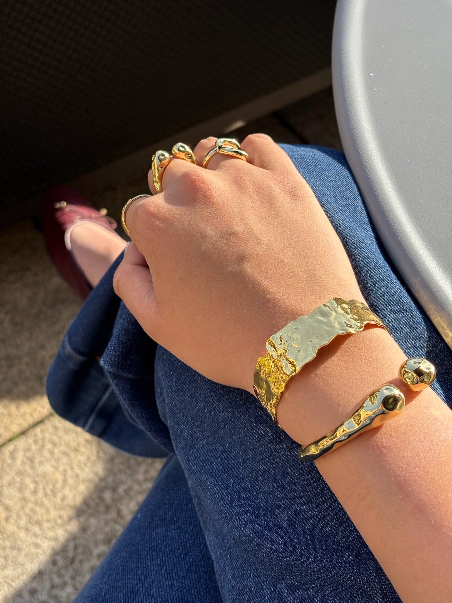 Das Armband Mantova besticht durch seine organische Struktur und einzigartige Oberfläche – wie flüssiges Gold auf deiner Haut. Ein ausdrucksstarkes Statement für Individualität und zeitlose Stärke.