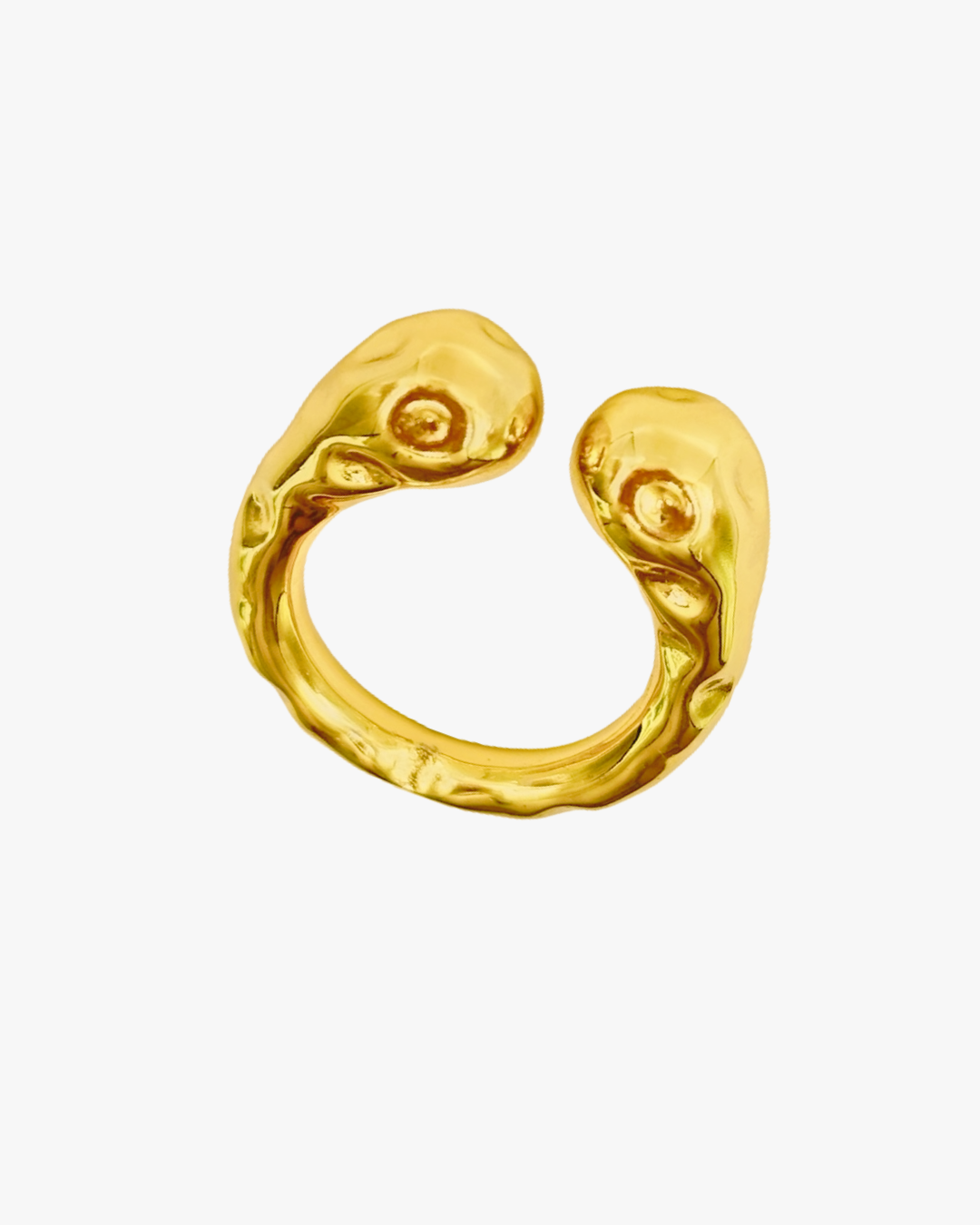 Der offene Ring ‚Costa Dorada‘ fängt das Licht ein wie warme Sonnenstrahlen, die auf einer goldenen Küste tanzen. Die sanft gehämmerte Oberfläche sorgt für eine verspielte Struktur, die an das funkelnde Meer an Spaniens Küsten erinnert.