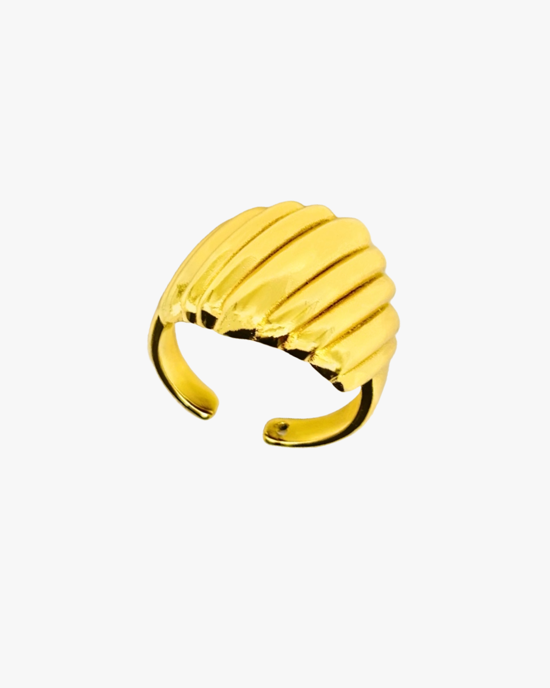 Ein Statement für selbstbewusste Eleganz: Dieser offene Ring in glänzendem Gold-Finish besticht durch seine sanft geschwungenen Rillen, die an feine Wellen erinnern. Das einzigartige Design setzt einen kraftvollen Akzent an Ihrer Hand und sorgt für einen Hauch von Luxus – ob im Alltag oder zu besonderen Anlässen.